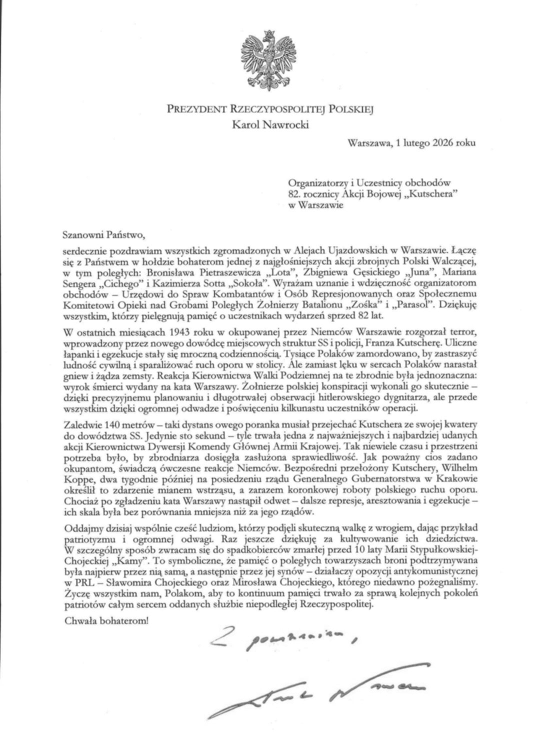 - W tę rocznicę wspominamy zarówno bohaterów, którzy przeprowadzili tę znakomicie zaplanowaną akcję, ale przywołujemy też pamięć o wszystkich ofiarach hitlerowskiego terroru na terenach okupowanej Polski. Pamiętajmy jakie skutki może nieść za sobą nienawiść i pogarda, kiedy nie napotka na opór i nie zostanie powstrzymana w odpowiednim momencie. Cześć i chwała bohaterom!