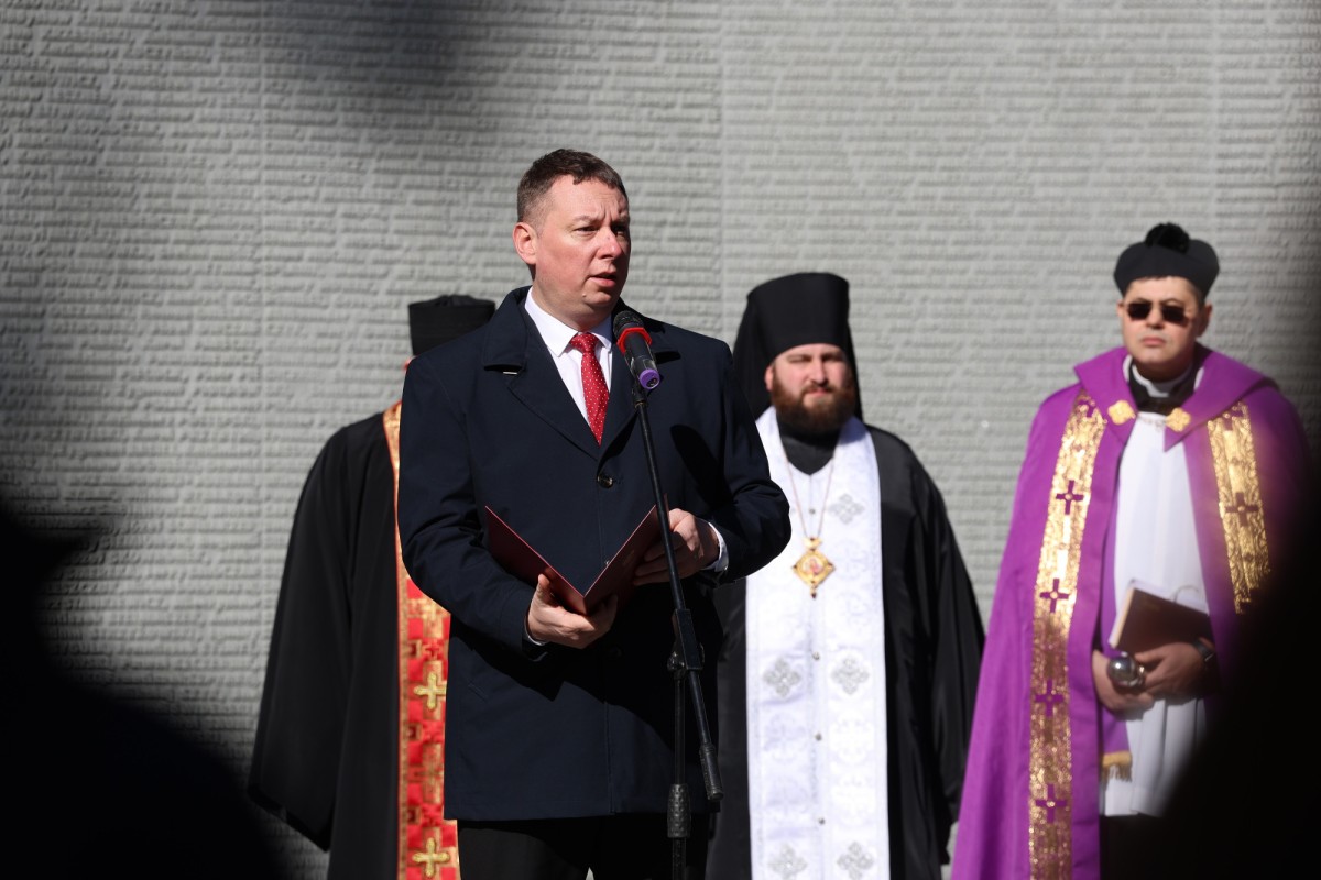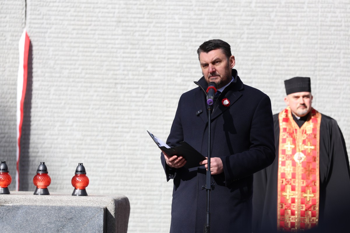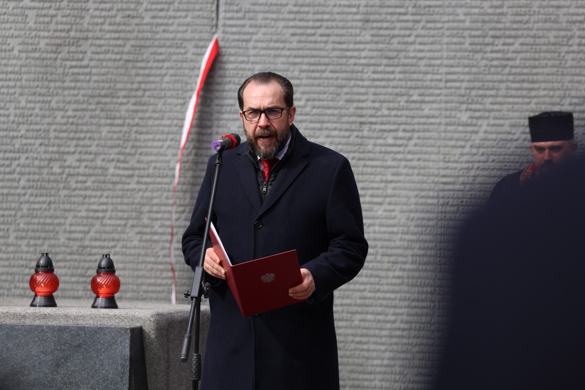 Po odegraniu hymnów Polski i Ukrainy głos zabrał minister Lech Parell, który w jednoznacznych słowach przypomniał o ofiarach stalinowskiej zbrodni i katyńskim kłamstwie, z którym mierzyć się musiały rodziny, badacze i pokolenia Polaków.